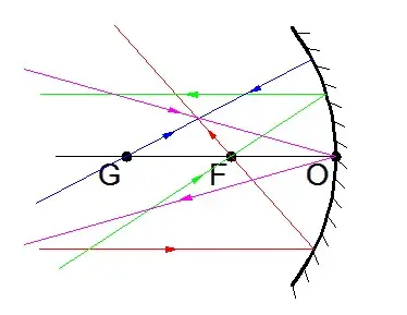 | A geometriai középpontba (G) irányuló fénysugár önmagába verődik vissza. | → | |